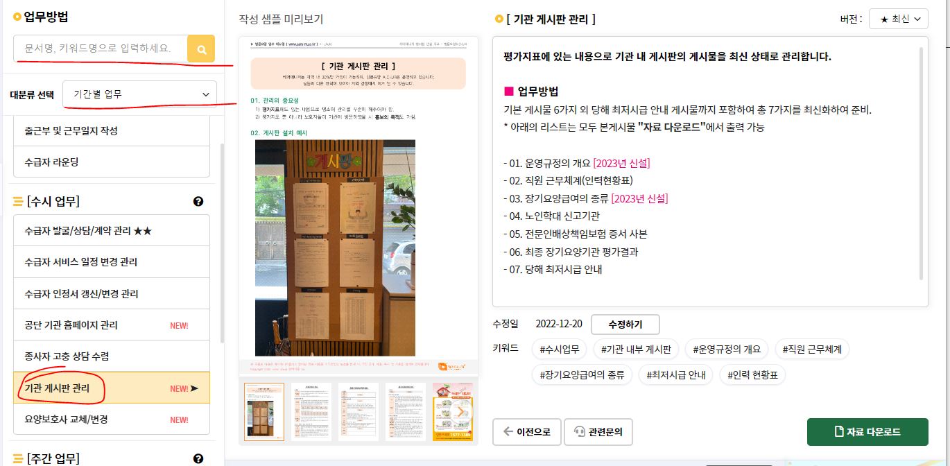 케어매니저 업무방법에서 대분류 "기간병 업무" -> [수시업무] -> 기관 게시판 관리에서 확인가능합니다.