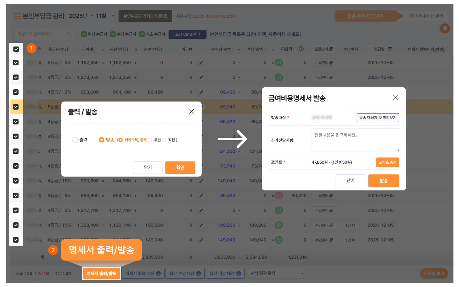 - 명세서 발송 대상자 선택 후, 명세서 출력/발송 버튼을 눌러주세요.