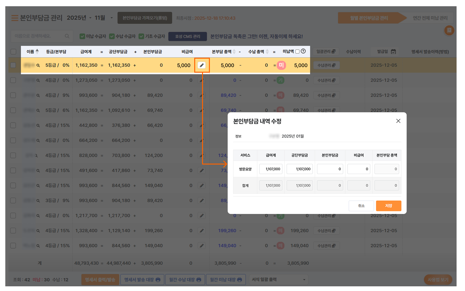 - 본인부담금 금액 수정이 필요한 수급자 내역에 펜 모양 아이콘을 눌르면 금액을 수정할 수 있는 내역들이 제공됩니다.- 본인부담금 내역의 금액을 수정 후, 저장 버튼을 눌러주시고 수정된 금액을 확인해주시면 됩니다.
