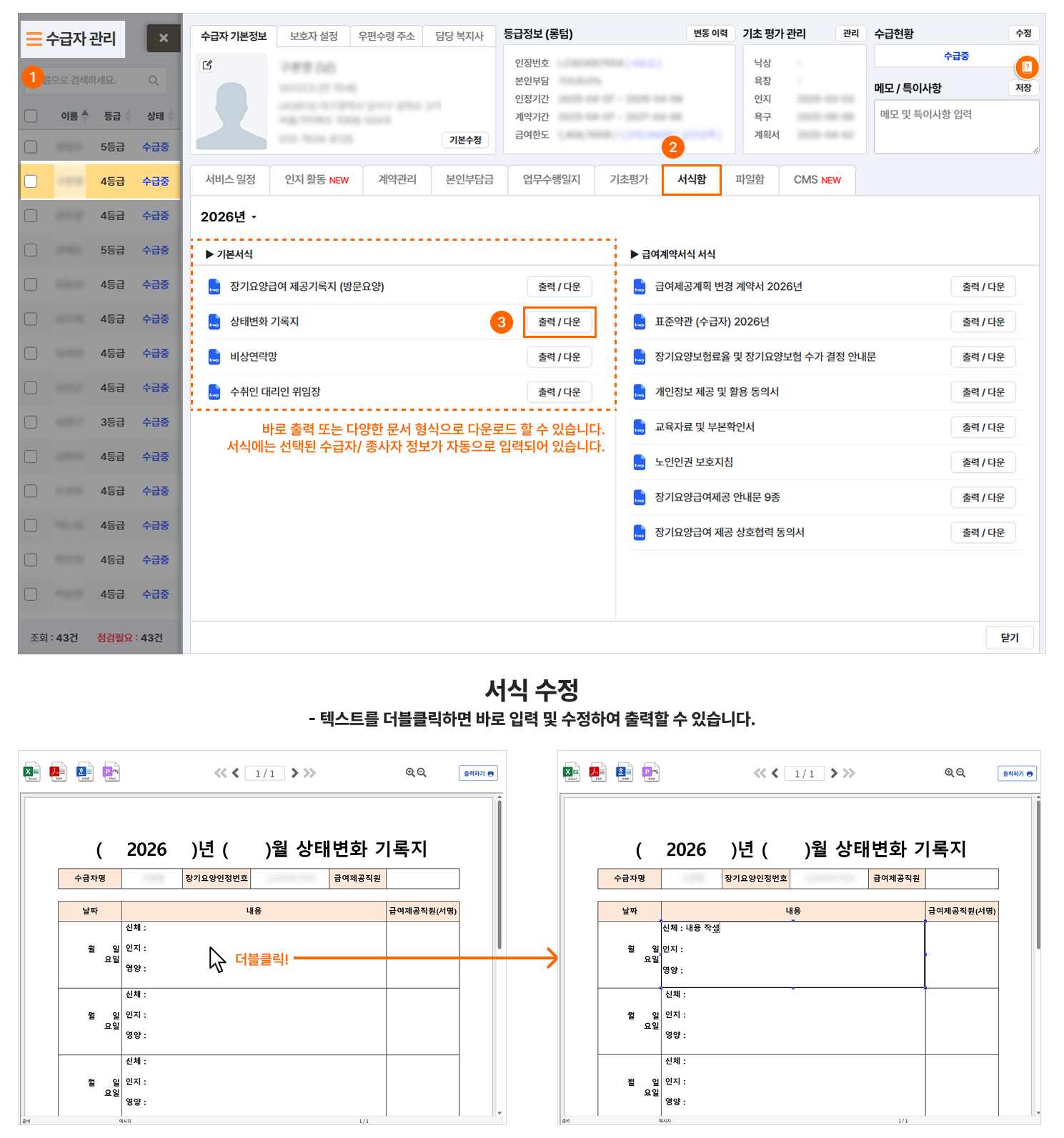 수급자, 종사자의 서식함에는 업무에 필요한 서식이 준비되어 있습니다.