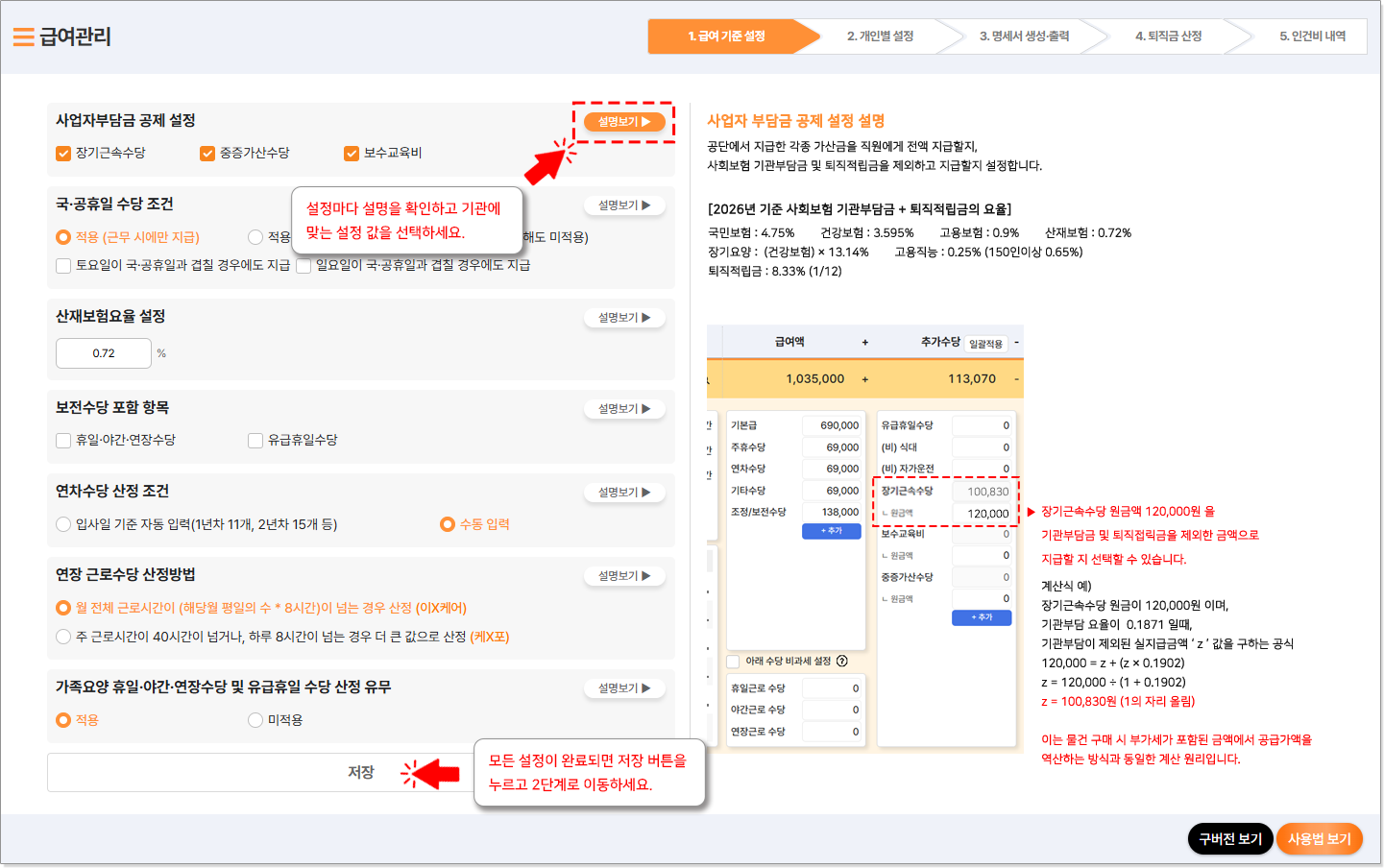 급여관리 1단계 '급여 기준 설정'에서는 공제항목 등 기관에 운영에 맞게 급여 설정을 할 수 있습니다.