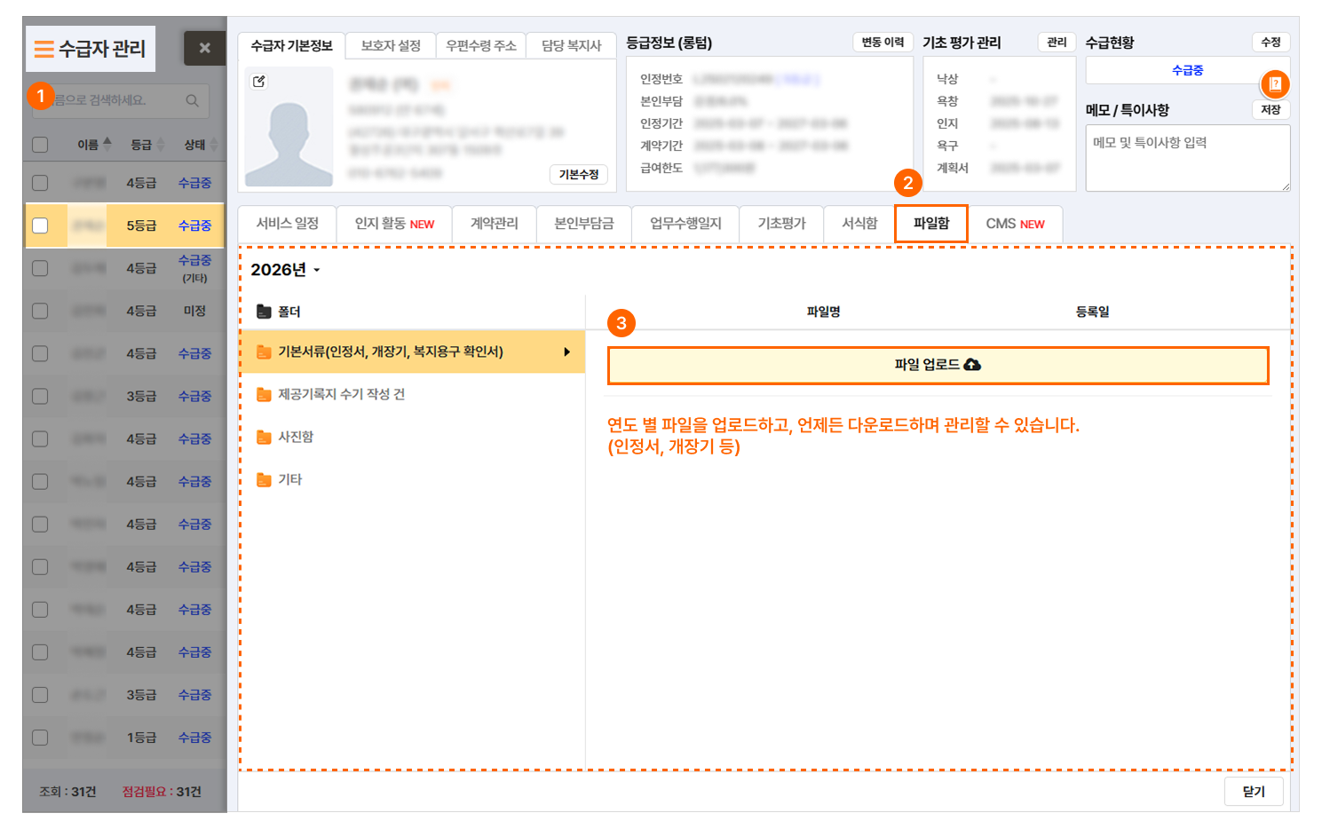 수급자, 종사자의 파일함은 각 대상자별 관리가 필요한 문서를 저장하고