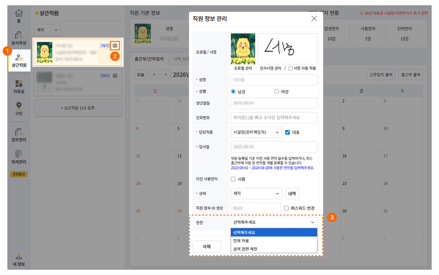 3. 직원 정보 관리에서 마지막 부분에 '권한'에서 허용 범위를 선택하여 설정 후 저장해주시면 됩니다.