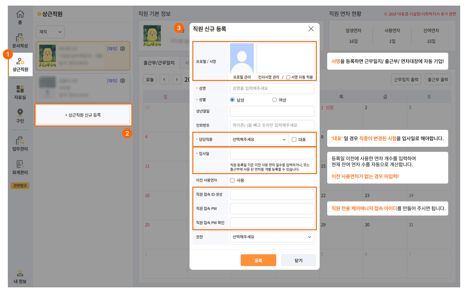 3. 직원 신규 등록에서 서명등록, 직원 전용 케어매니저 접속 아이디를 만들어 주실 수 있습니다.