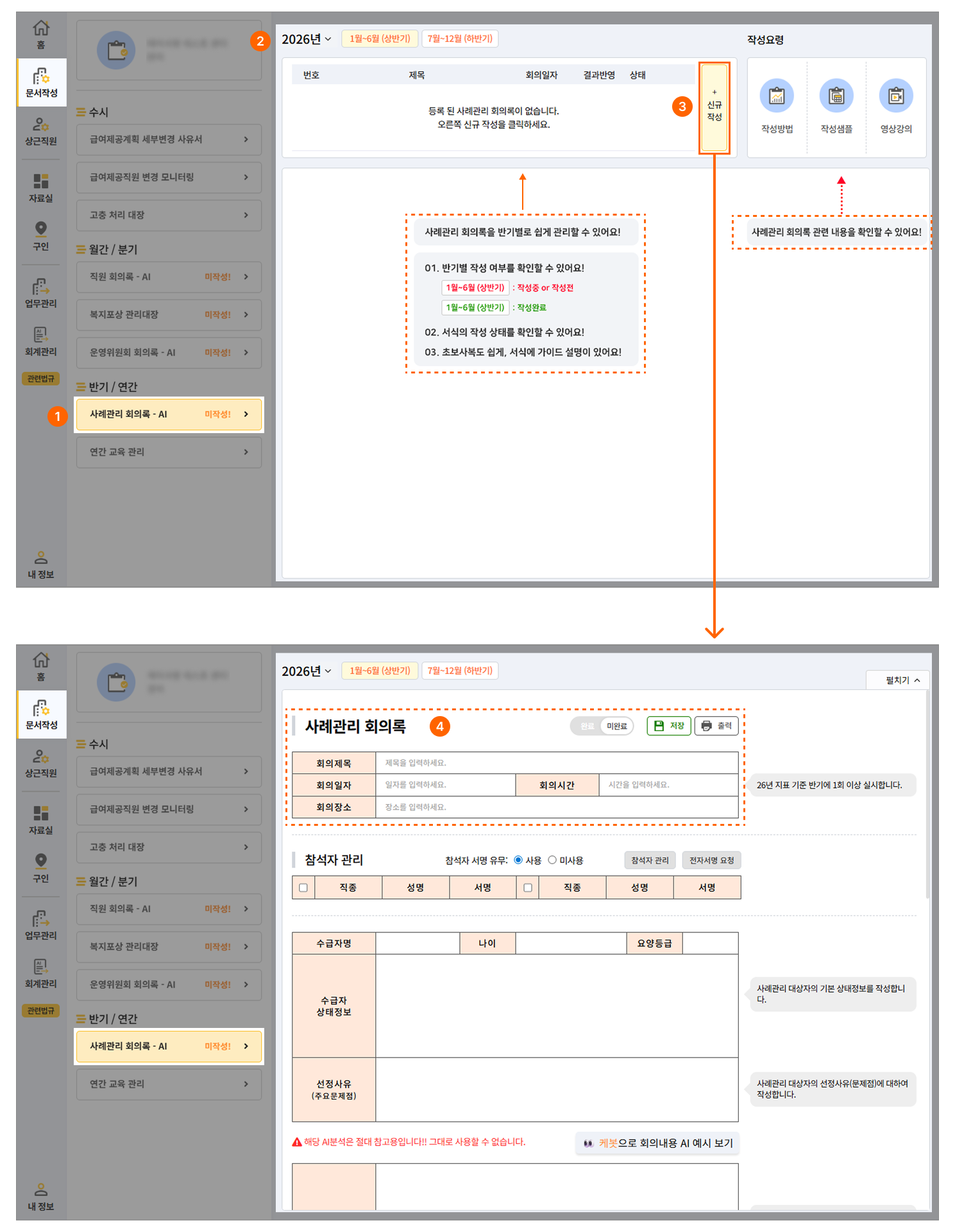 1. 문서작성 -> 사례관리 회의록 - AI 을 눌러주세요. (미작성 상태일 때 확인 필요)